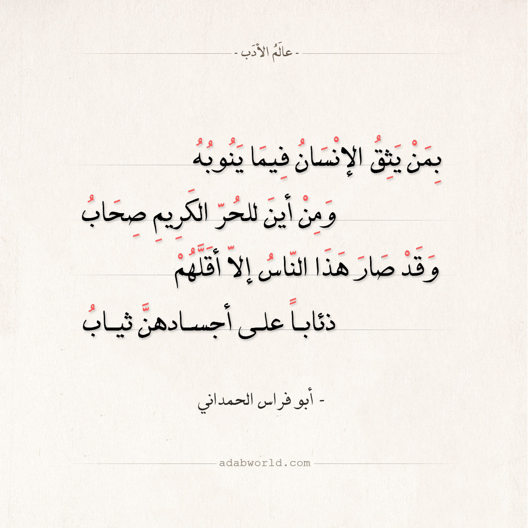 وَألْحَظُ أحْوَالَ الزّمَانِ بِمُقْلَة بها الصدقُ صدقٌ والكذابُ كذابُ بِمَنْ يَثِقُ الإنْسَانُ فِيمَا يَنُوبُهُ وَمِنْ أينَ للحُرّ الكَرِيمِ صِحَابُ؟ وَقَدْ صَارَ هَذَا النّاسُ إلاّ أقَلَّهُمْ ذئاباً على أجسادهنَّ ثيابُ — أبو فراس الحمداني أجمل ما قيل:أبو فراس الحمدانيحكمشعر